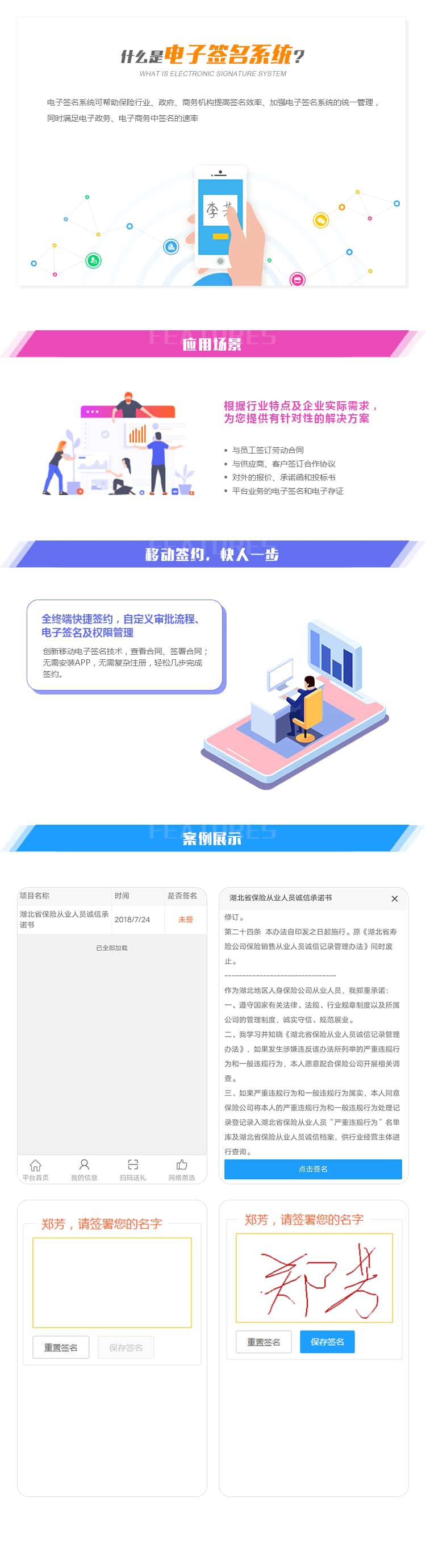 创新移动电子签名技术,查看合同、签署合同;无需安装APP,无需复杂注册,轻松几步完成签约。